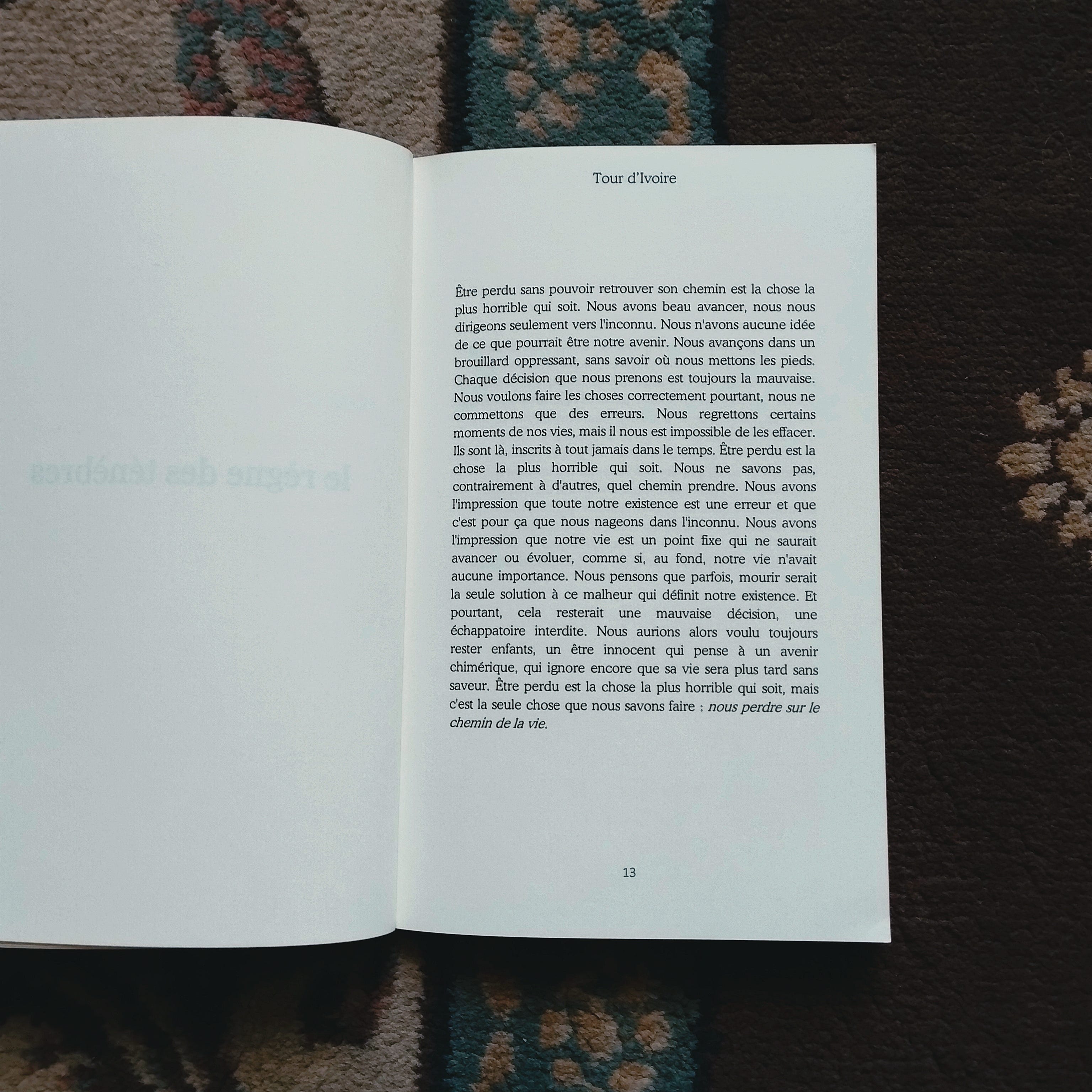 D’ailleurs, quand j’ai fait lire Tour d’Ivoire à mon père, il m’a dit que ce n’était pas un recueil de poèmes, mais un recueil de textes. Quand je reçois ce genre de remarques, je me remémore ce que Poisson Rouge m’a dit un jour : “Anything can be a poem if you believe it”. Alors, oui, maintenant, je n’ai plus peur de dire que j’écris de la poésie. Qui oserait dire que Les Illuminations de Rimbaud n’est pas de la poésie à cause de l’absence de vers ?